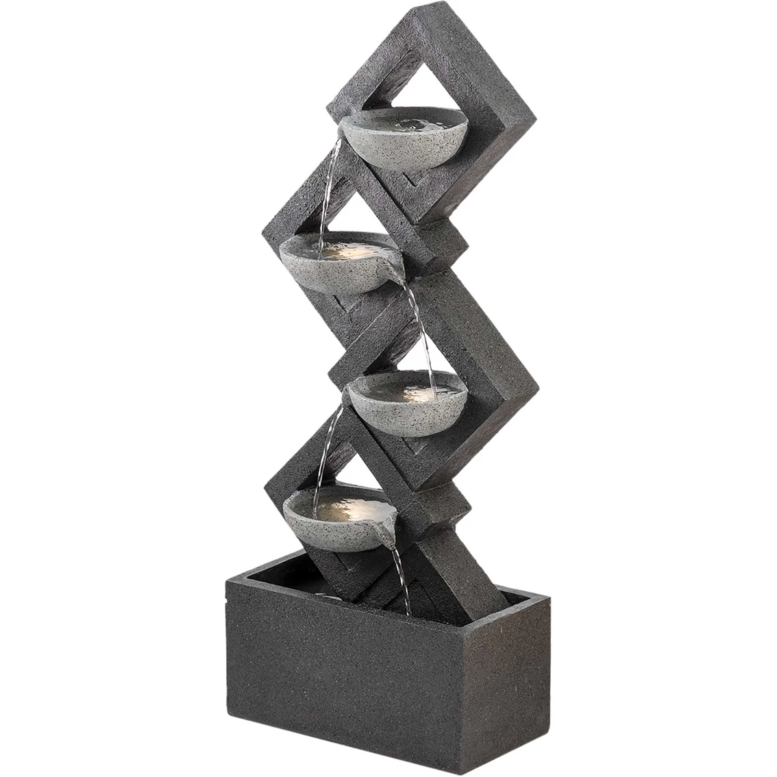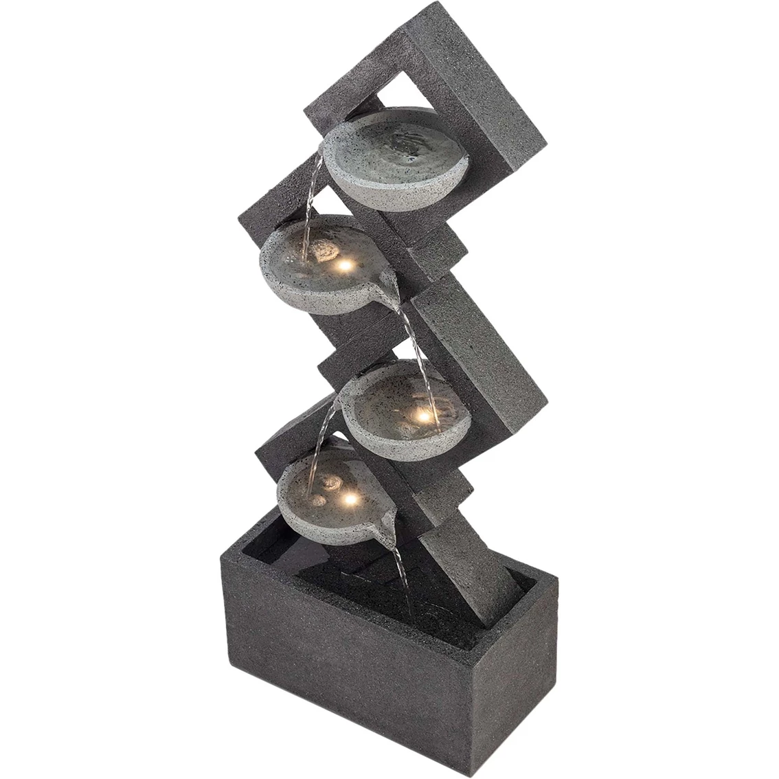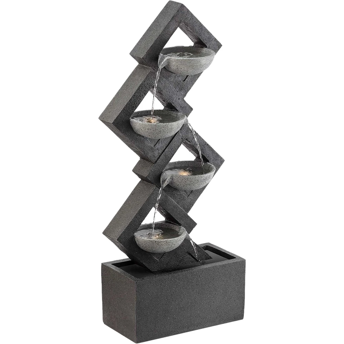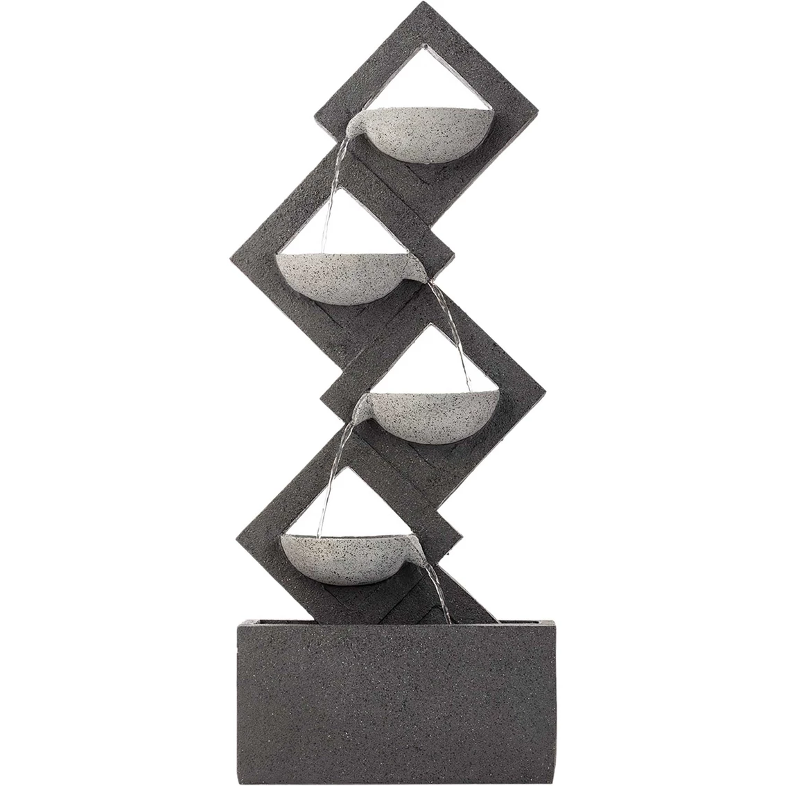 Enhance any room with the calming sounds of this 4-Tiered Wall Fall Fountain from Alpine. The modern styling of this fountain fits well with contemporary decor. Fountain has a 5-liter water capacity. Model: GIL1642.