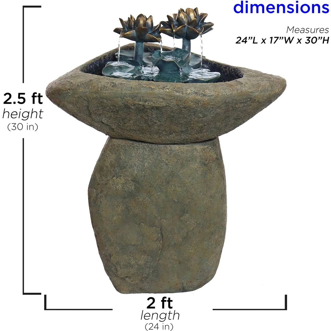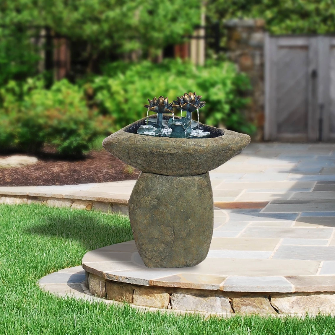 This Lotus Rock LED Fountain from Alpine looks carved out the top of a natural boulder balancing on another boulder. The top of the fountain features two lotus flowers with water flowing out of them. Model: USA1393.