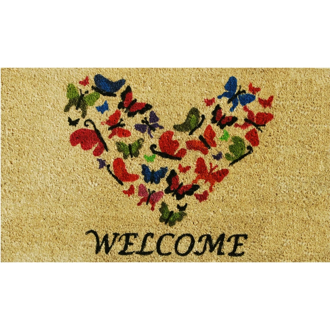 The 17 x 29 in. Butterfly Welcome Doormat from Callowaymills is made of natural coir, a dense fiber that is naturally mold and mildew resistant. Coir is a renewable resource that is durable and coarse, excellent for scraping shoes clean. Vinyl backed for increased durability and to help prevent movement, this coir doormat is weather tolerant, absorbs moisture and retains its shape. For best results, keep in a sheltered area such as a covered porch, keeping extreme moisture and sunlight to a minimum. Vacuum, sweep or lightly hose clean. Model: 121801729.