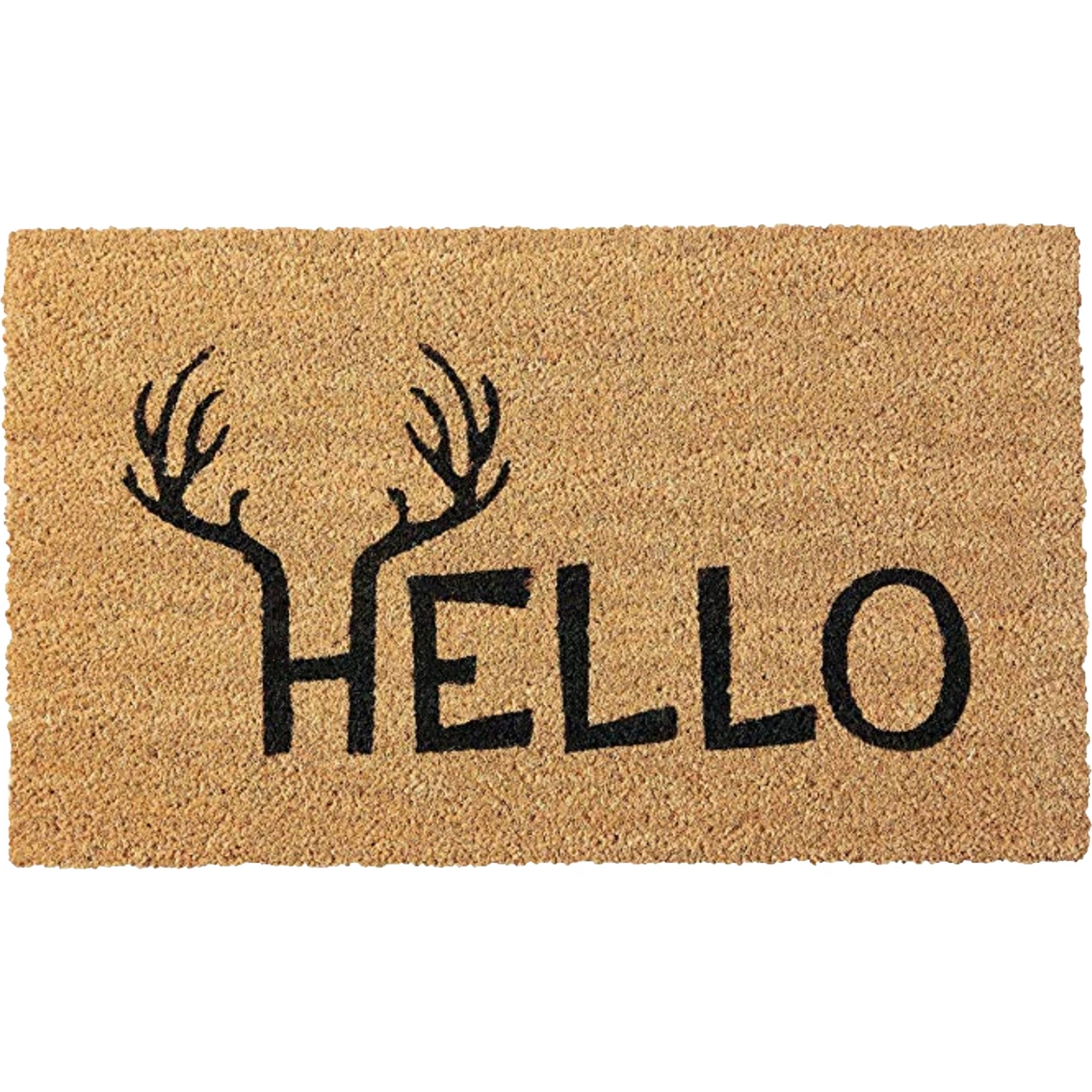 The Calloway Mills 17 x 29 in. Antler Hello Doormat is made of all-season colorfast and weather tolerant, durable coir that scrapes shoes clean. Coir is a renewable resource that is durable and coarse ,excellent for scraping shoes clean. Vinyl backed for increased durability and to help prevent movement, coir doormats are weather tolerant, absorb moisture and retain their shape. Model: 121711729.
