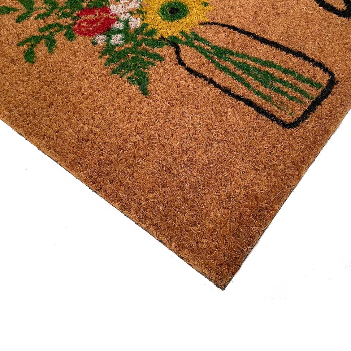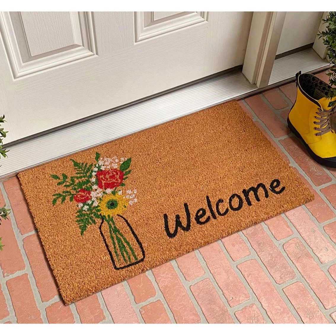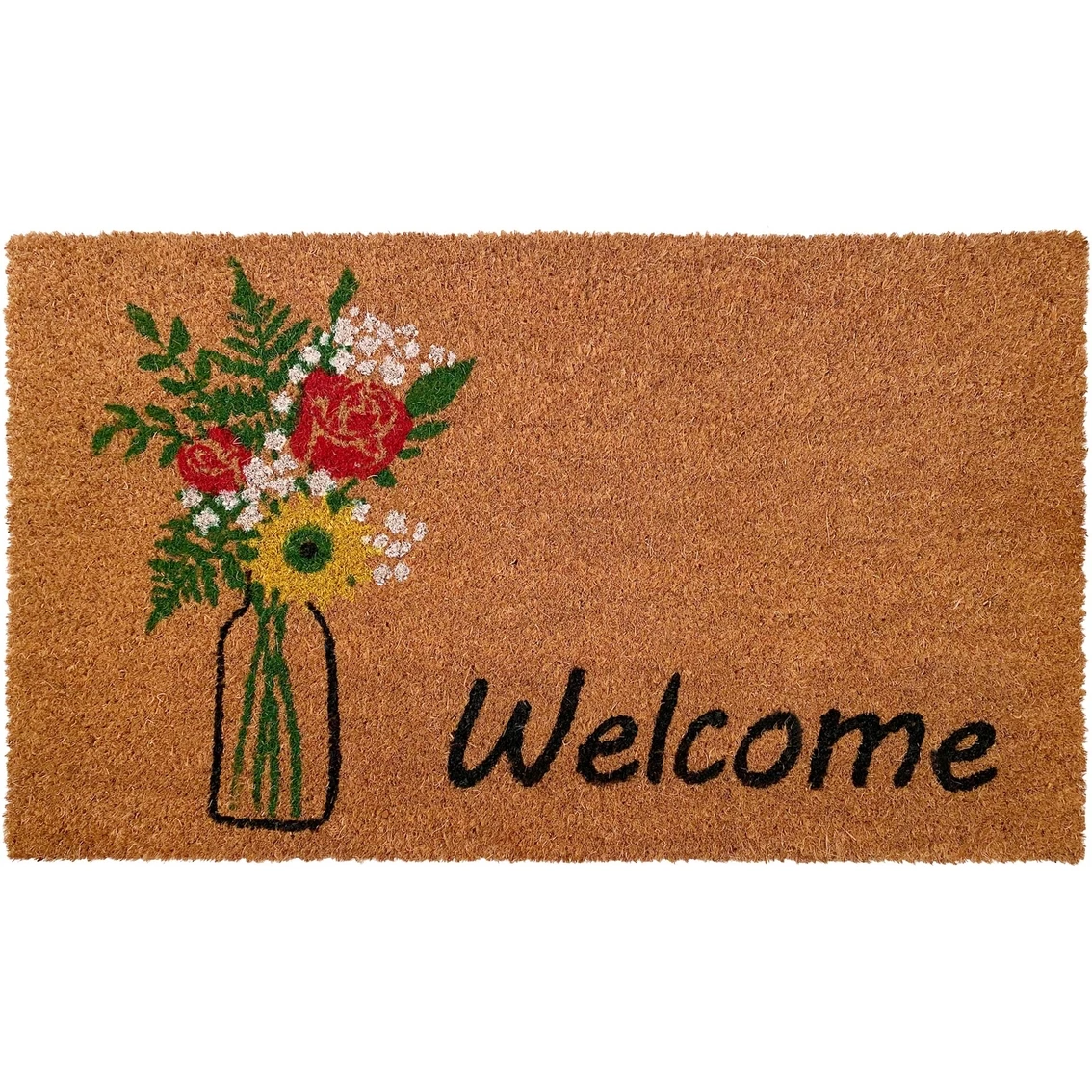 Leave a bouquet of flowers at your door with this summer-style doormat from Calloway Mills. Made of natural coir, a dense fiber that is naturally mold and mildew resistant. Coir is a renewable resource that is durable and coarse, excellent for scraping shoes clean. Vinyl backed for increased durability and to help prevent movement, coir doormats are weather tolerant absorb moisture and retain their shape. For best results keep in a sheltered area such as a covered porch, keeping extreme moisture and sunlight to a minimum. Vacuum, sweep or lightly hose clean. Model: 103381729.