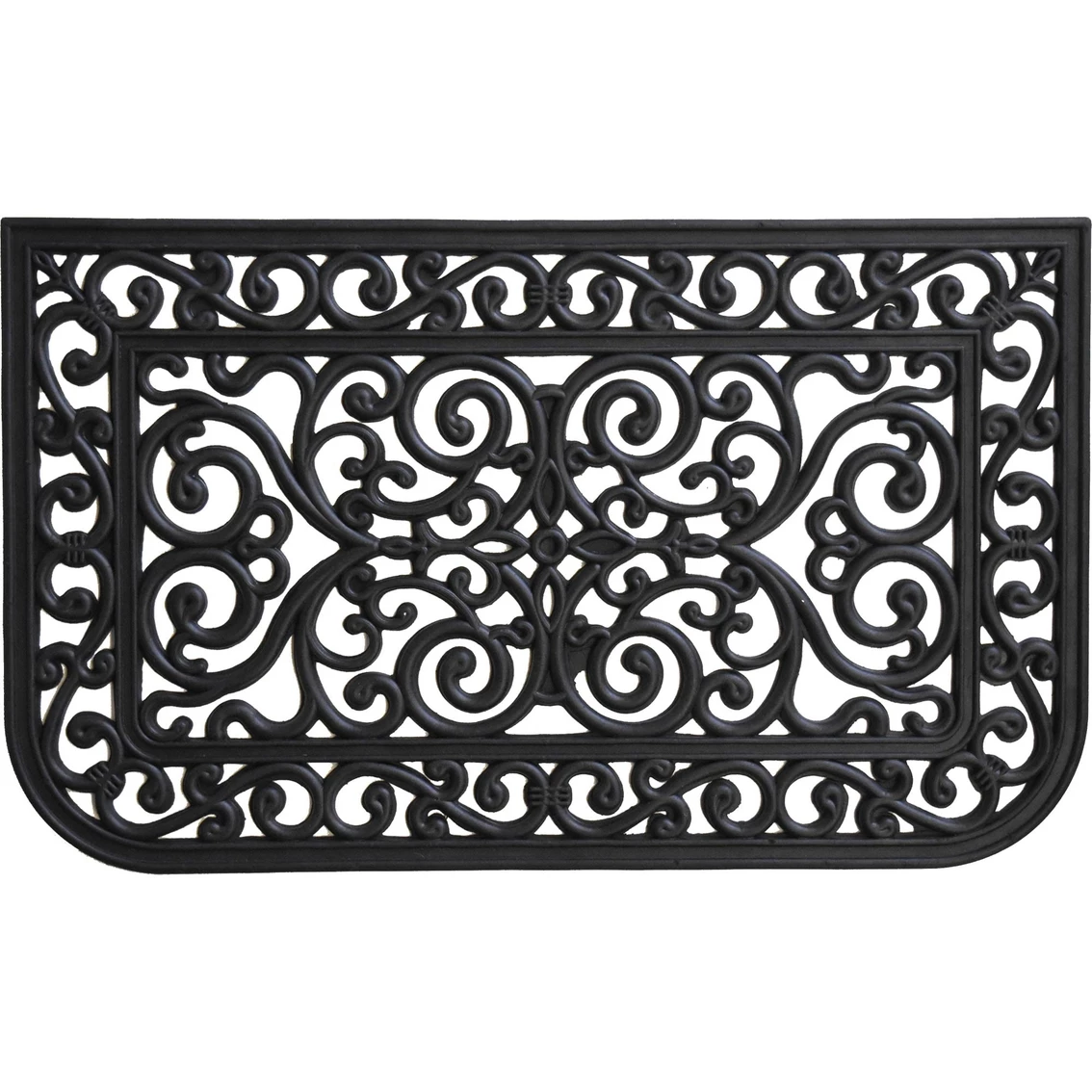 Welcome your guests with this Haligrand Doormat from Calloway Mills, made of 100% rubber and impervious to the elements of weather. With a detailed scroll that emulates wrought iron, this heavy-duty 18 x 30 in. mat makes a gorgeous addition to any porch or patio area. Extremely durable, won’t mold or mildew. Hose clean.