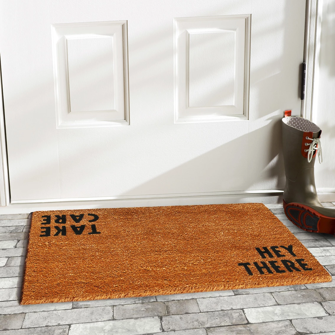 Greet your guest outside of the door with this nice doormat from Calloway Mills. Made of natural coir, a dense fiber that is naturally mold and mildew resistant. Coir is a renewable resource that is durable and coarse, excellent for scraping shoes clean. Vinyl backed for increased durability and to help prevent movement, coir doormats are weather tolerant absorb moisture and retain their shape. For best results keep in a sheltered area such as a covered porch, keeping extreme moisture and sunlight to a minimum. Vacuum, sweep or lightly hose clean. Model: 100512.
