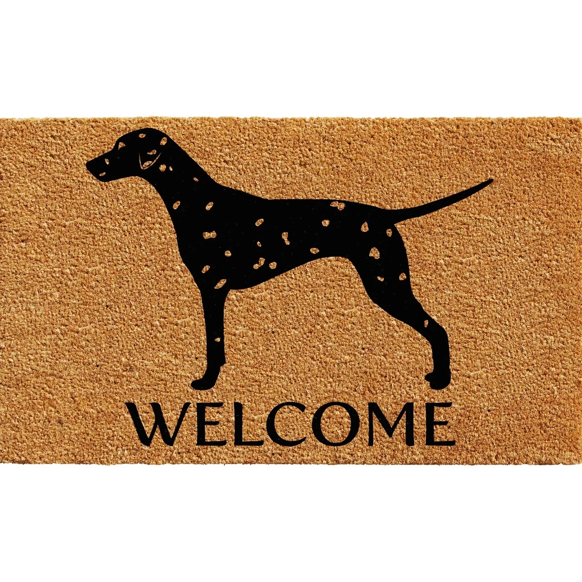 The Calloway Mills Dalmatian Doormat is made of natural coir, a dense fiber that is naturally mold and mildew resistant. Coir is a renewable resource that is durable and coarse, excellent for scraping shoes clean. Vinyl backed for increased durability and to help prevent movement, coir doormats are weather tolerant absorb moisture and retain their shape. For best results keep in a sheltered area such as a covered porch, keeping extreme moisture and sunlight to a minimum. Vacuum, sweep or lightly hose clean.