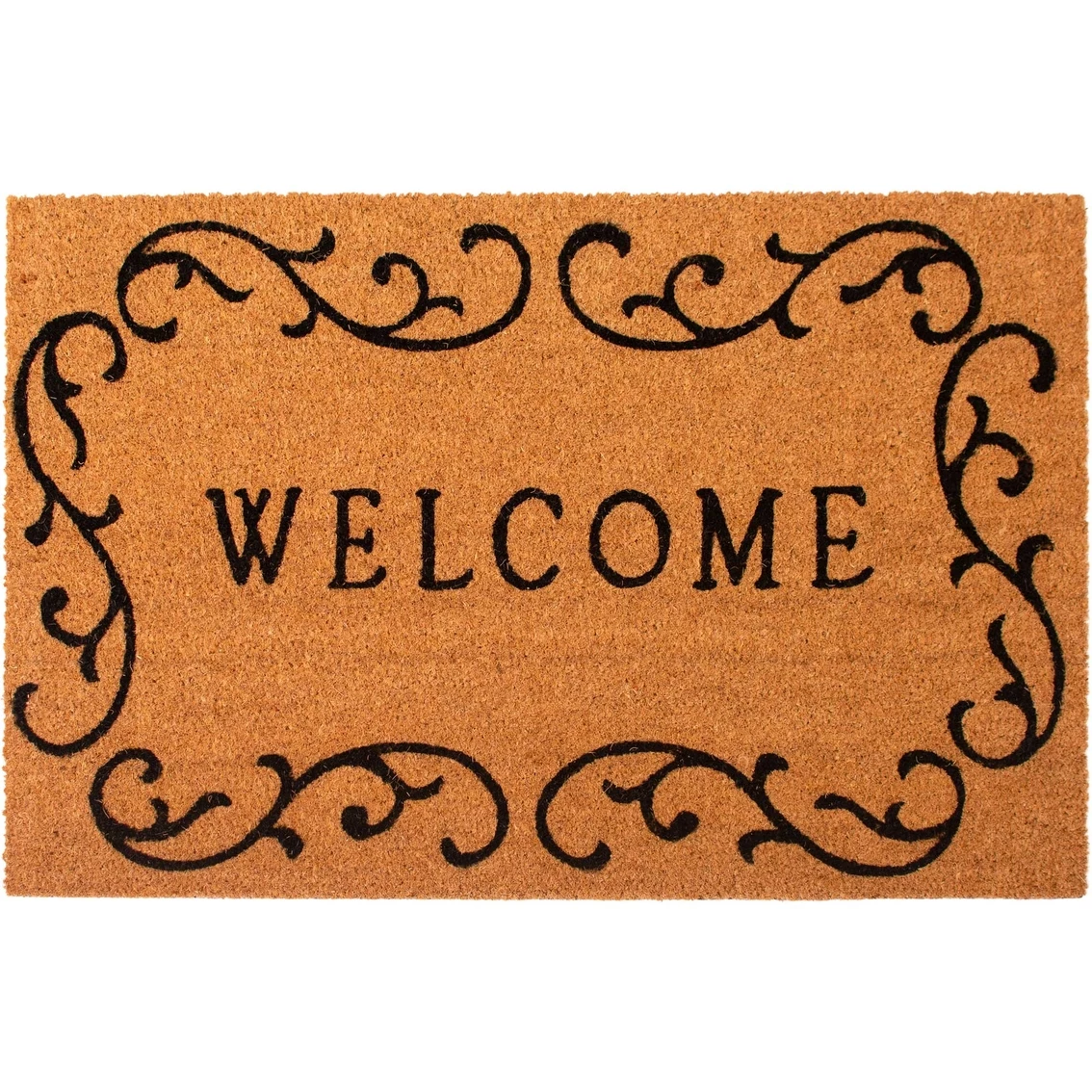 All-season colorfast and weather tolerant, this Welcome Curlicue 17 x 29 in. Doormat from Calloway Mills is made of durable coir that scrapes shoes clean. A vinyl backing helps prevent movement.