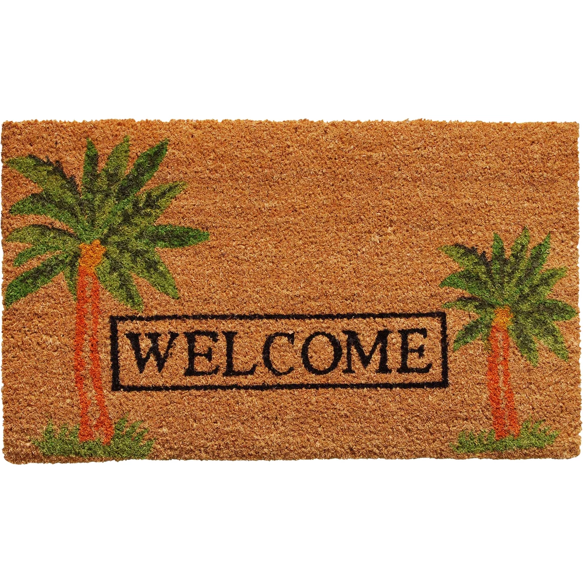 The Callowaymills Palm Welcome Doormat is an all season colorfast and weather mat. Made of natural coir, a renewable resource that is durable and coarse, excellent for scraping shoes clean. Vinyl backed for increased durability and to help prevent movement. Coir doormats are weather tolerant absorb moisture and retain their shape. 17 x 29 inches. Model: 120521729.