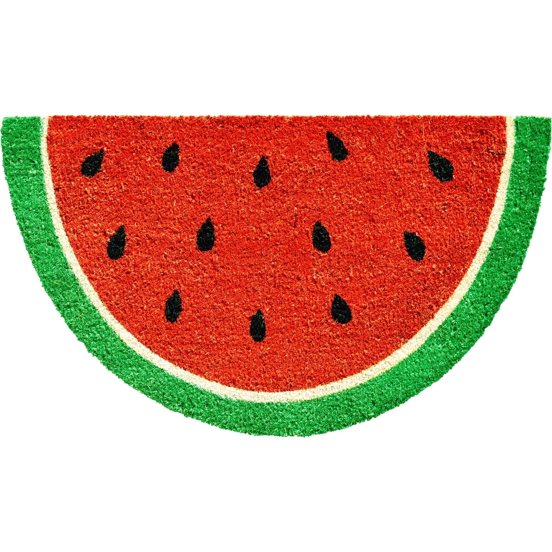The Callowaymills Watermelon Slice Doormat is an all season colorfast and weather mat. Made of natural coir, a renewable resource that is durable and coarse, excellent for scraping shoes clean. Vinyl backed for increased durability and to help prevent movement. Coir doormats are weather tolerant absorb moisture and retain their shape. 17 x 29 inches. Model: 104041729.
