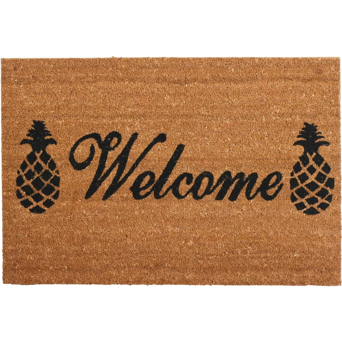 The Callowaymills Welcome Pineapples Doormat is an all season colorfast and weather mat. Made of natural coir, a renewable resource that is durable and coarse, excellent for scraping shoes clean. Vinyl backed for increased durability and to help prevent movement. Coir doormats are weather tolerant absorb moisture and retain their shape. 17 x 29 inches. Model: 102501729.
