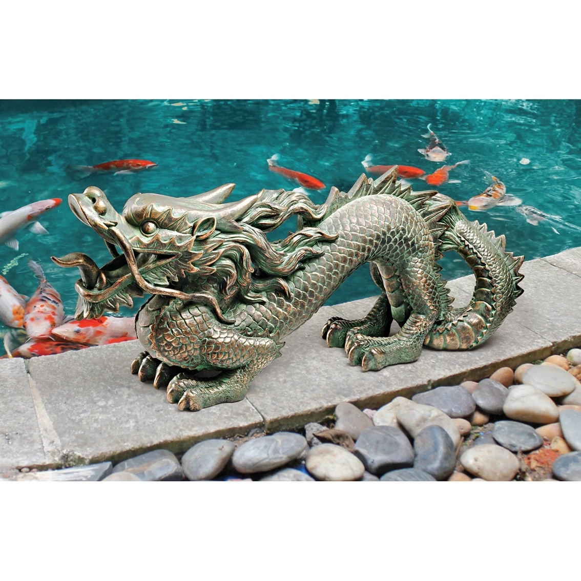 In the tradition of grand Chinese dragons of the Far East, this Asian Dragon statue lends an Oriental elegance to a pond, as a flowerbed centerpiece or as an Asian garden focal point. Cast exclusively for Design Toscano in quality designer resin with a rich verdigris bronze finish, this symbol of abundance and prosperity will lend its good will for years to come. Great for dragon collectors and lovers of Asian art too! Measurements: 21 in. W x 4.5 in. D x 8 in. H. Weight: 8 lb. Model: EU9306.