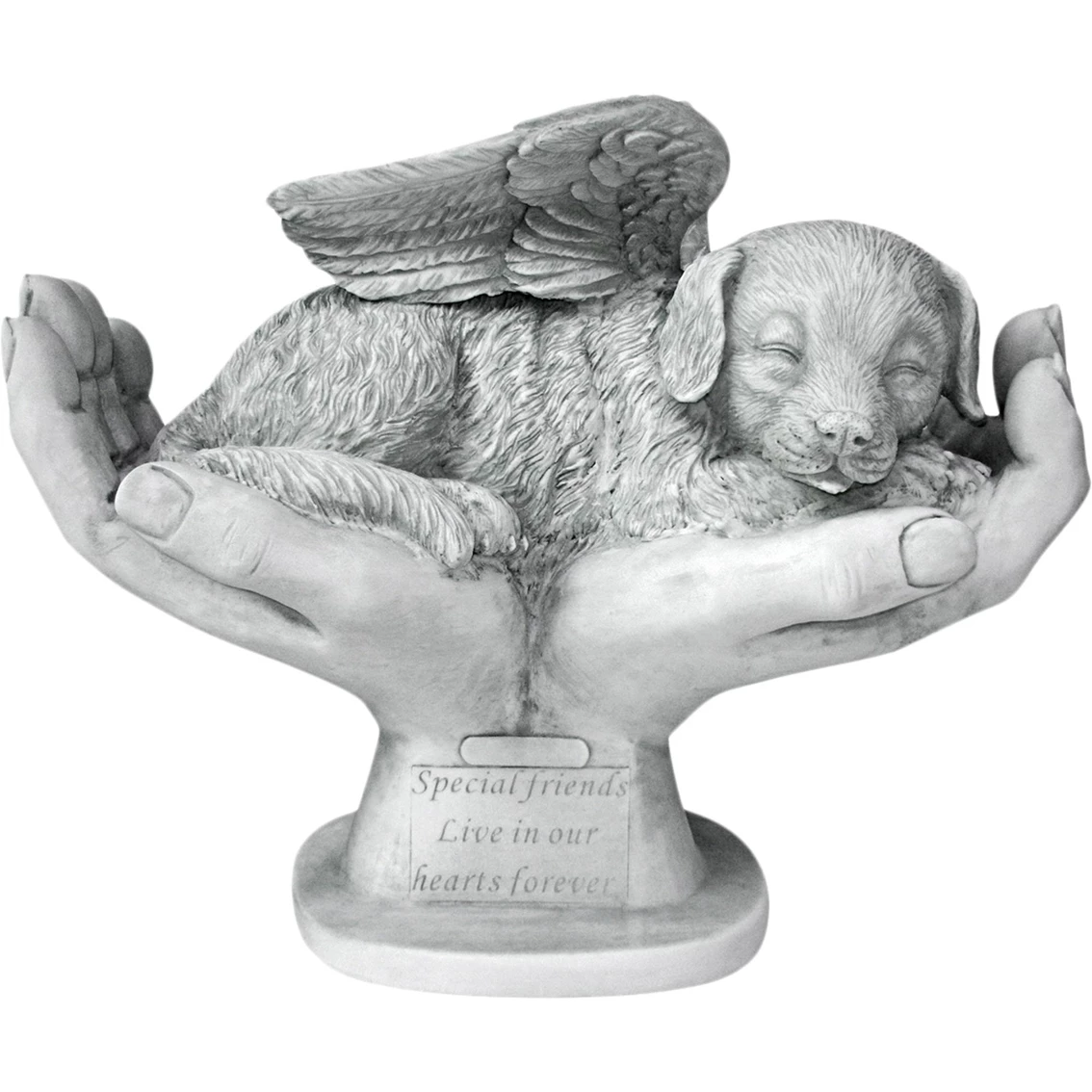 Our hearts never truly say goodbye to a special pet, do they? Preserve a treasured memory for yourself or a loved one with this dog memorial tribute cast in quality designer resin and hand-painted one piece at a time. This Design Toscano exclusive remembers a beloved dog, remind us that “Special friends live in our hearts forever.” Whether in a special spot in your home or in a favorite garden spot, this thoughtful and healing gift honors a never-to-be-forgotten pet’s memory. There is space above the verse for personalized plaque to be added by customer. Measurements: 15.5 in. W x 7.5 in. D x 12.5 in. H. Weight: 5 lb. Model: KY69912.