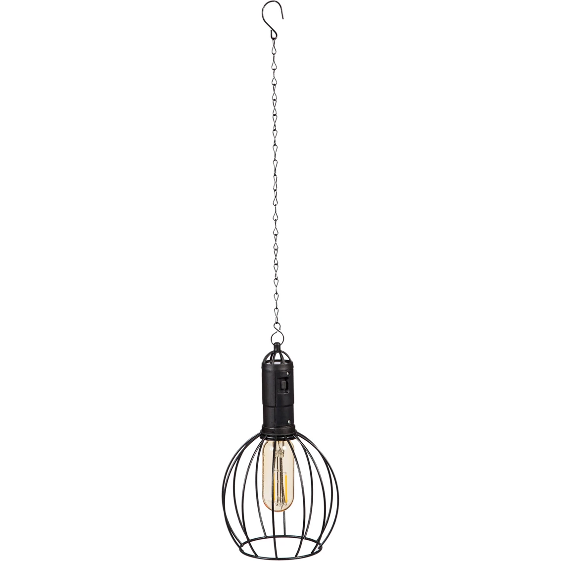 This outdoor safe pendant light from Evergreen is powered by the sun. Lantern is rounded with a wire frame and vintage style LED bulb and 9.13 in. chain with a hook for easy hanging. Solar battery is included. 19.6 in. tall. Model: 2SP5282.