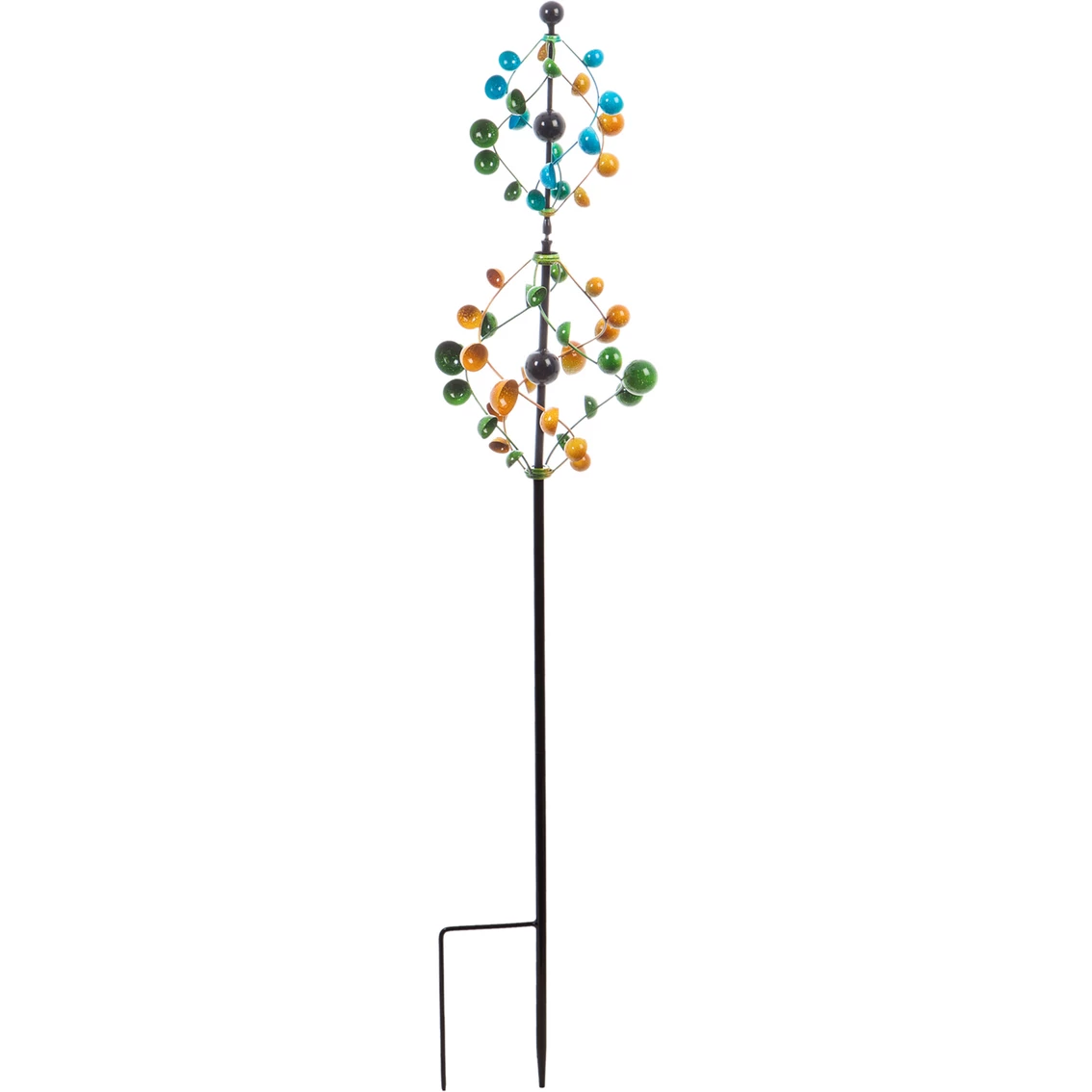Evergreen 60 in. H Swirling Bubble Wind Spinner – This 2-tier kinetic wind spinner has a multi-color bubble design. The bubbles swirls around the 60 in. stake in layers. It includes an H Stake and Pole: .75 in.=19mm. Assembly required. Measures: 12.6 in. W x 12.6 in. L x 60 in. H. Watch the video to see it in motion. Model: 47M2194.