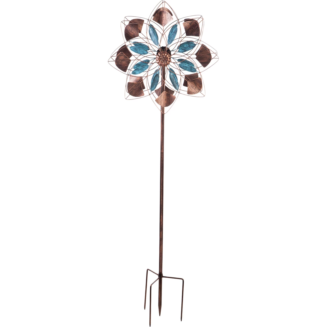 This kinetic wind spinner from Evergreen has verdigris blue-green and copper petals. It includes a 3 prong stake and pole. Assembly required. Model: 47M2363.