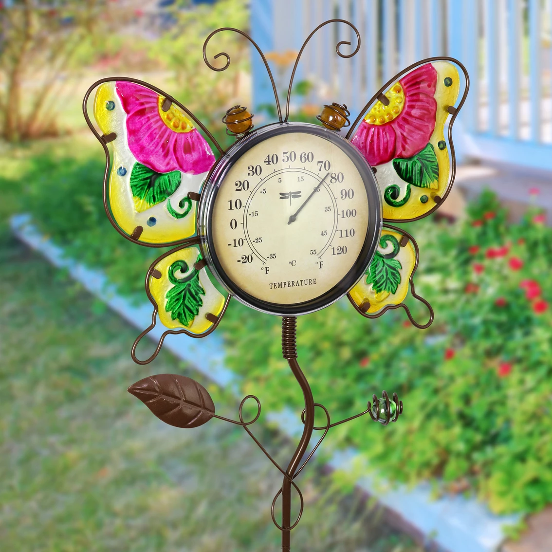Beauty meets function with this adorable Butterfly Thermometer Garden Stake. Beautifully hand painted with great details and crafted of durable glass and metal. Standing at 36 inches, this butterfly garden stake makes a colorful, fun and practical addition to any home!