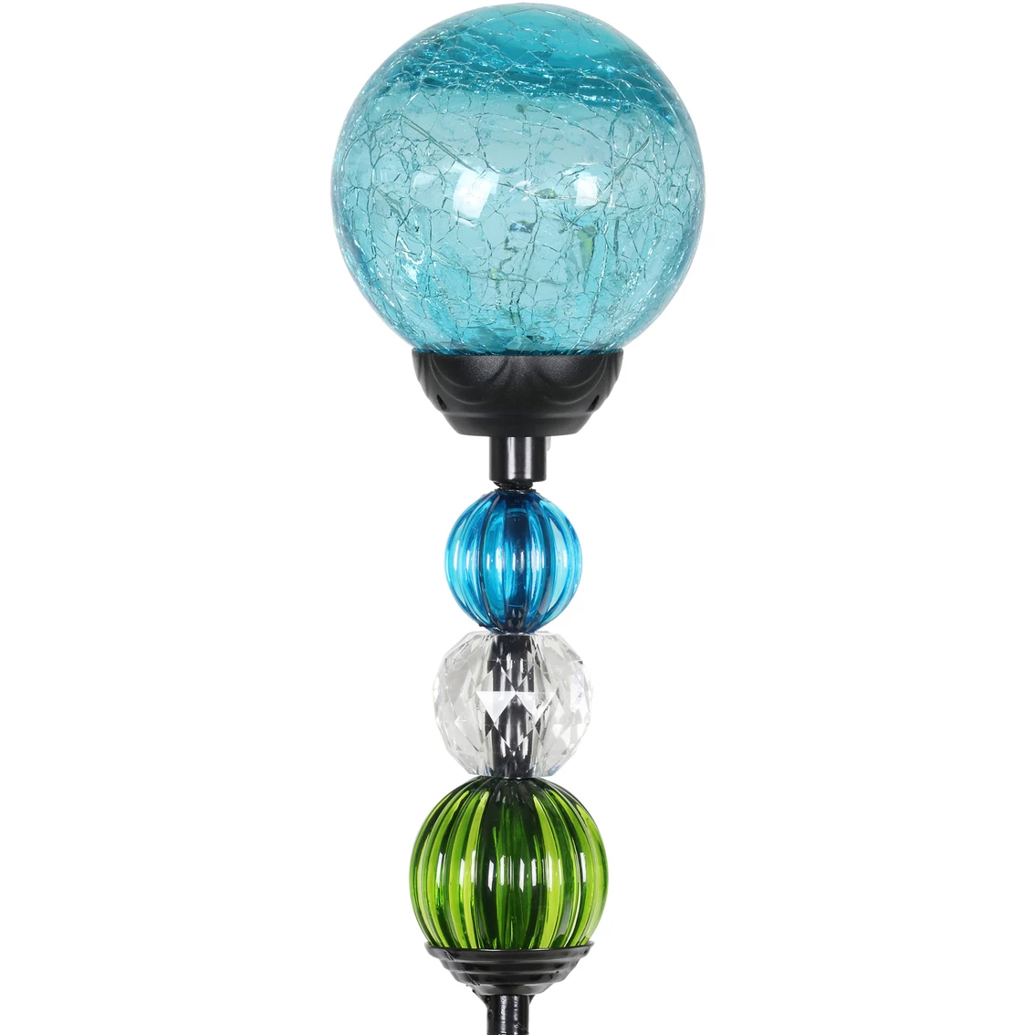This Illuminating Solar Blue Crackle Glass Ball Stake adds a decorative touch to your garden day and night. As the sun sets and dusk settles in, your beautiful glass stake glows from within. The colorful beaded details add an extra touch of elegance. This stake from Exhart makes a thoughtful gift and a wonderful addition to any landscape. Model: 16735-RS.