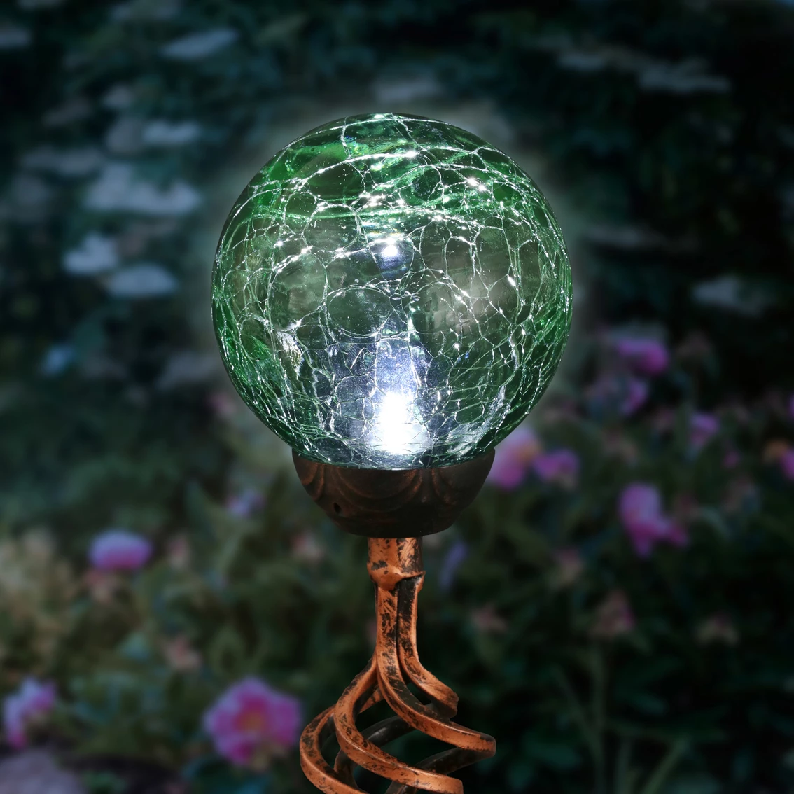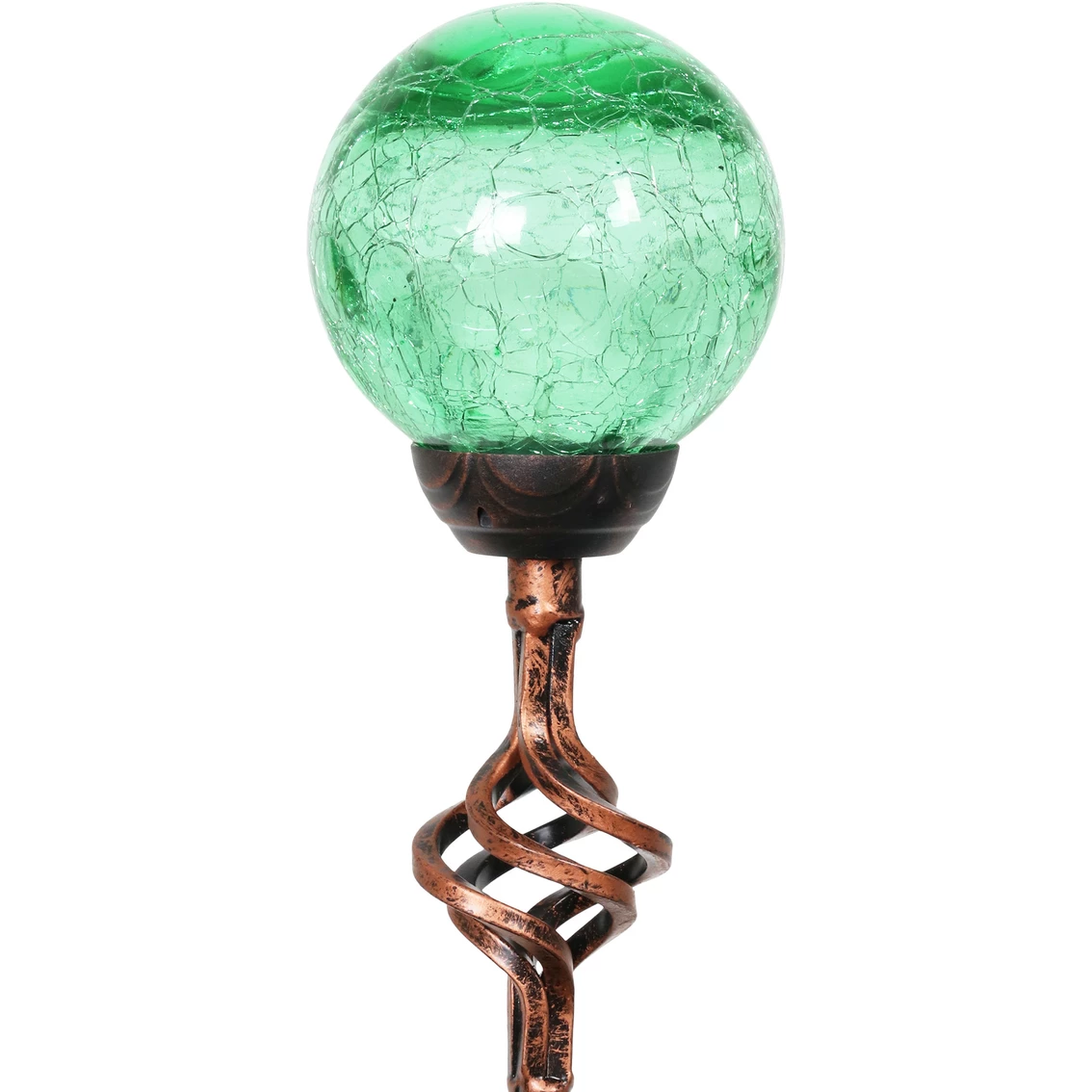 Illuminating Solar Green Crackle Glass Ball Stake from Exhart adds a decorative touch to your garden day and night. As the sun sets and dusk settles in, your solar-powered glass stake glows from within. The spiraling metal finial adds and extra touch of elegance. This beautiful 4 x 31 in. garden stake makes a thoughtful gift and a wonderful addition to any landscape. Model: 16452-RS.