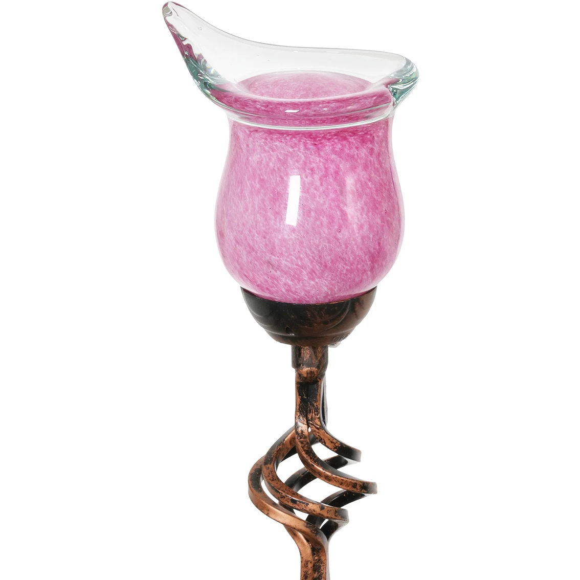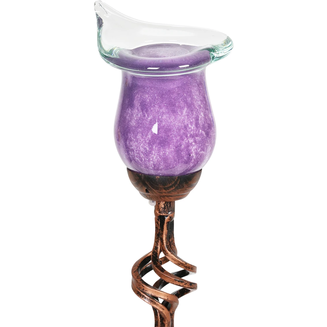 This Solar Calla Lily Garden Stake from Exhart adds a touch of romance to your garden! Illuminating flower is made of beautiful color infused hand-blown glass. The spiraling metal detail adds and extra touch of elegance. Makes a wonderful addition to any home. Size: 4 x 31 in.