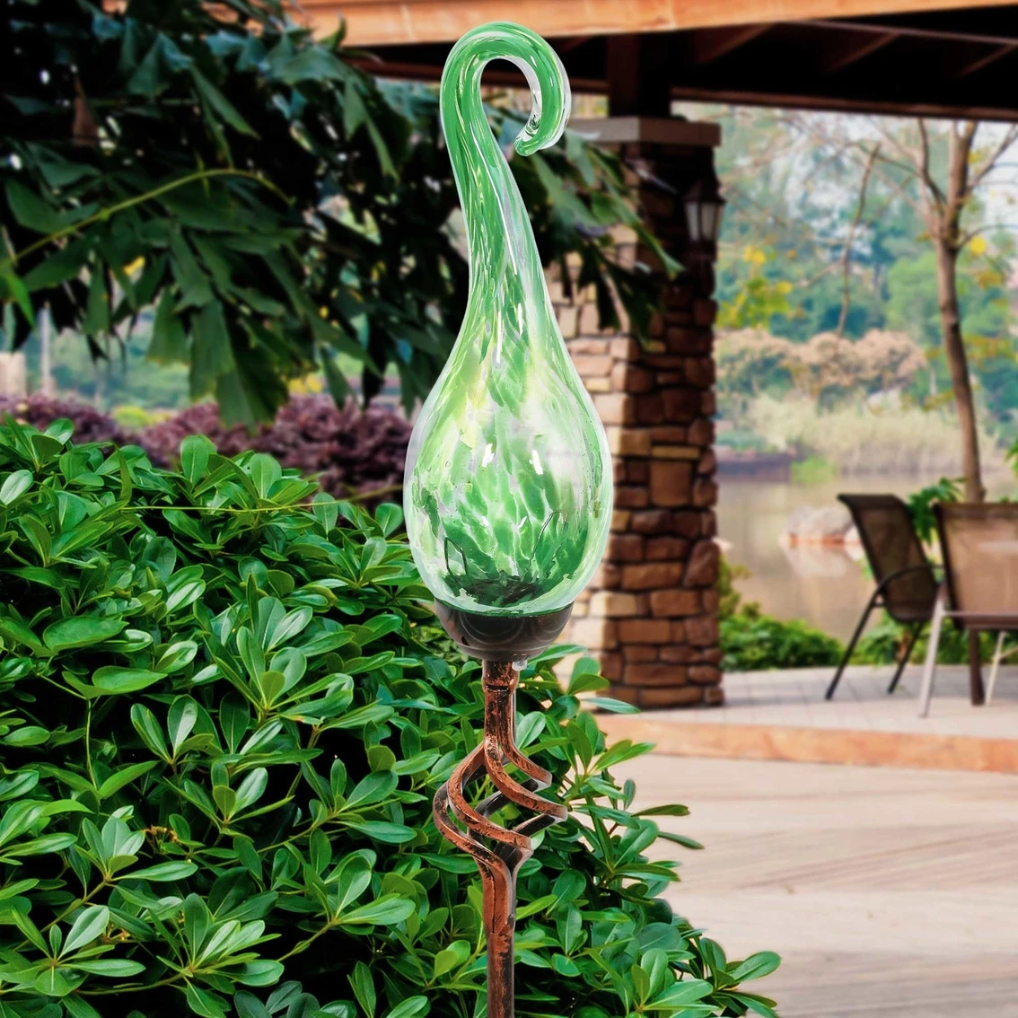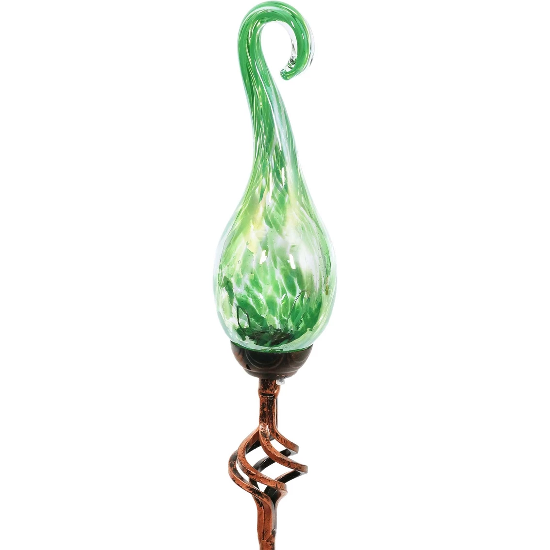 Add a touch of color and light to your garden with this elegant Solar Hand-Blown Pearlized Glass Twisted Flame Garden Stake from Exhart. The Solar powered LED will automatically illuminate the glass every evening adding a beautiful green glow to your garden. Stake is 36 in. tall with metal finial detail. The perfect addition to your landscape! Model: 14176-RS.