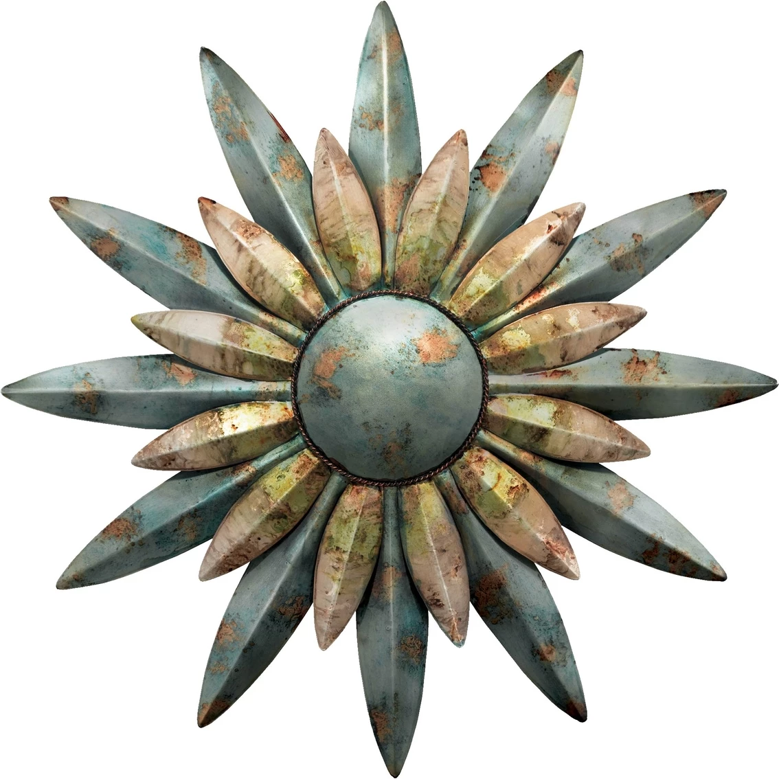 This 29 in. Aqua Sunburst Sun from Regal Arts has a marbled rustic lacquer finish accented with muted metallic coloring. Carefully crafted from sturdy metal, the hand-painted colors and powder coat lets you display the decor indoors or out. Weather-resistant finish and overall durable construction assures enjoyment for many years to come. Model: 10200.