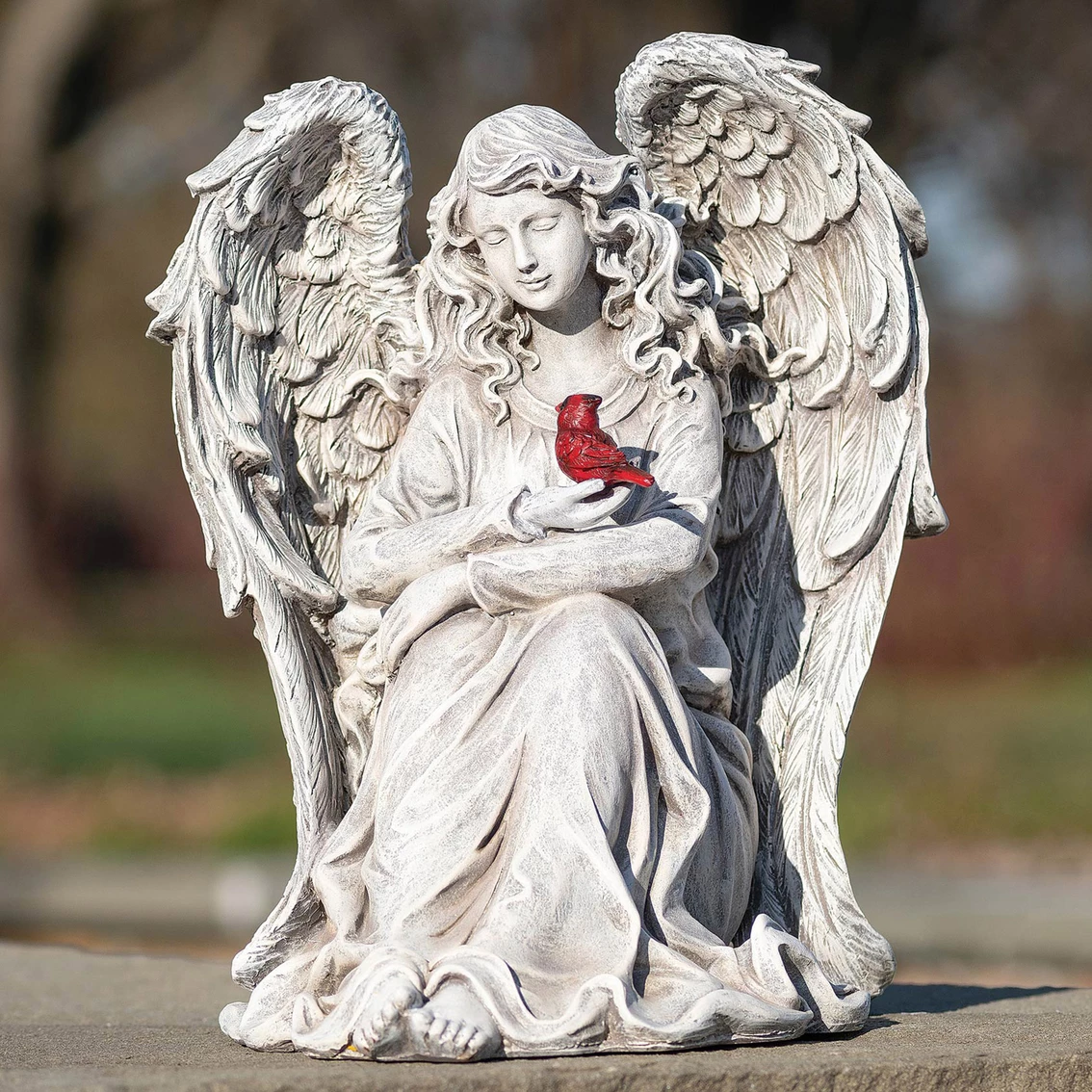 When a cardinal appears an angel is near. This is a special remembrance of one who has passed. This piece offers a serene and peaceful scene for any special place of remembrance. Made of a resin and stone mix, the statue measures 11 in. H x 8.7 in. W x 9.1 in. L. Display it indoors or outdoors, in a flower be or on a lawn, balcony or porch. Model: 12527.